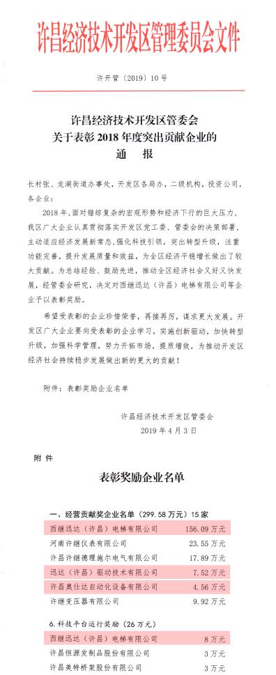 4月12日,西繼迅達電梯在經濟技術開發區管委會召開的2019年度工作會議上,被開發區管委會通報表揚,授予經營貢獻獎,并給予156萬元現金獎勵,位列經營貢獻獎企業首位。此外,西繼迅達還被授予8萬元科技平臺運行獎勵。