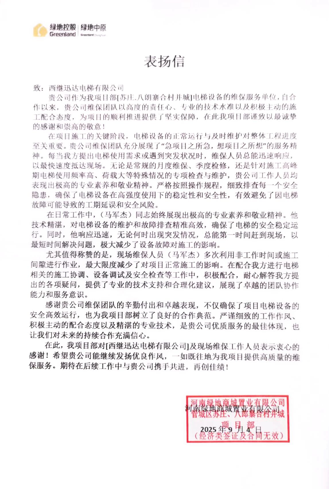 近日,一封來自河南綠地商城置業有限公司項目的表揚信送至西繼迅達電梯公司。信中表達了對西繼迅達維保服務項目團隊的肯定和感謝,對秉承客戶至上的精神、高主動性的服務,獲得項目方的信任與贊賞。并希望公司能繼續以客戶至上的精神,為項目提供更好、更專業的技術支持和服務!